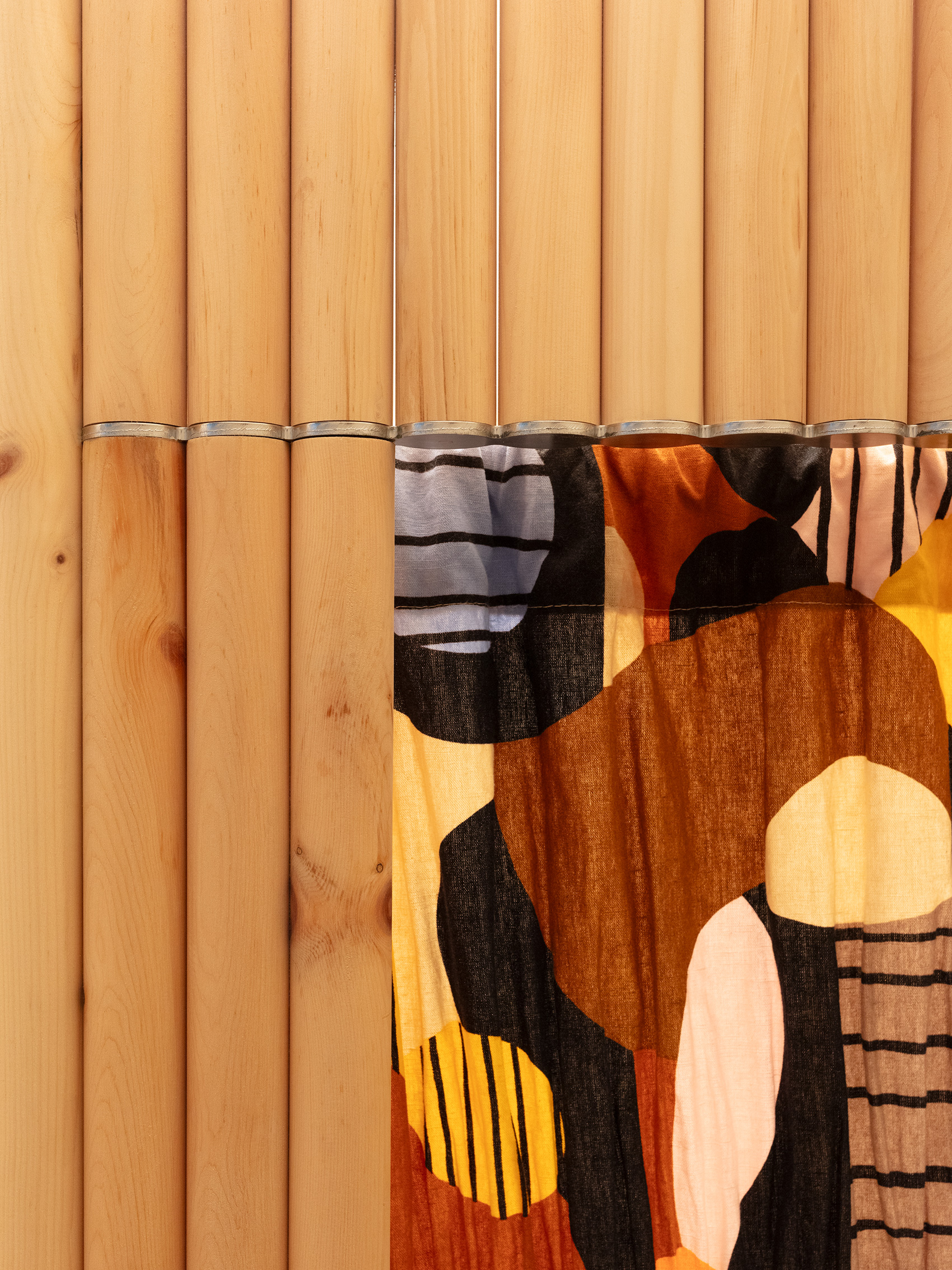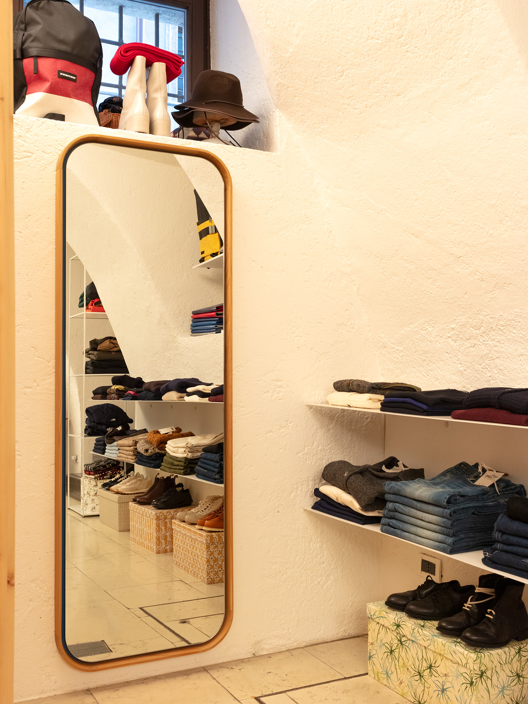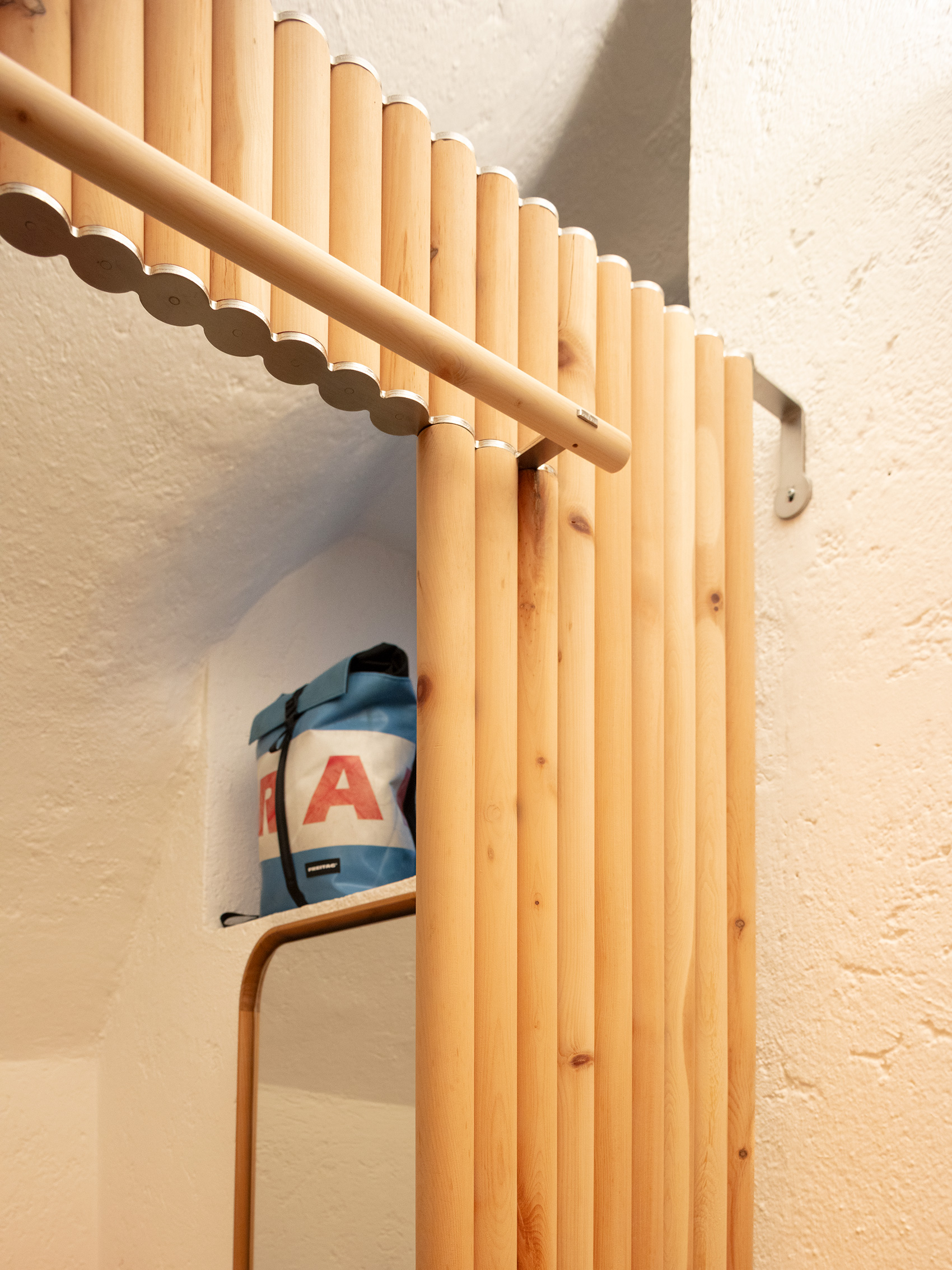 EN / Elegance, lightness, and resilience. Characteristics of a precious essence that help us build a welcoming and delicate atmosphere to offer a comfortable space to the boutique’s customers. A texture of slender cylinders in Swiss stone pine wood delimits a private area, creating a pleasant and refined environment. Accompanying the structure, two mirrors with curved and soft lines reflect the space in which they are placed.